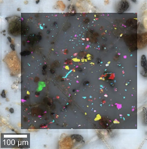 Mikroplastikpartikel einer Umweltprobe. Dargestellt ist eine Überlagerung des Raman und Weißlichtsbildes.Bildreferenz: Kernchen, Sarmite, et al. "Atmospheric deposition studies of microplastics in Central Germany." Air Quality, Atmosphere & Health 17.10 (2024): 2247-2261. Lizensiert unter Creative Commons CC-BY 4.0
