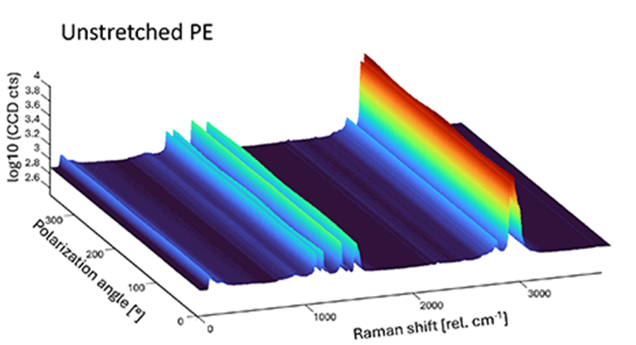 Die molekulare Struktur und Anordnung von Polymerfasern innerhalb von Kunststoffen hat einen signifikaten Einfluss auf die physikalischen Eigenschaften eines Polymers wie dessen Stabilität, Flexibilität und Transparenz. Polarisationsabhängige Raman-Analysen können dazu beitragen, die molekulare Struktur des Materials zu analysieren und die Ausrichtung der Polymerfasern zu identifizieren. In einer Untersuchung, die in der Eidgenössische Materialprüfungs- und Forschungsanstalt (Empa) durchgeführt wurde, haben wir polarisationsabhängige Raman Mikroskopie verwendet, um die Ausrichtung von Polyethylenfasern in einer Kunststofffolie zu bestimmen. Dadurch konnten wir die gleichmäßige Anordnung der Fasern innerhalb des Materials unter Zugspannung beobachten.